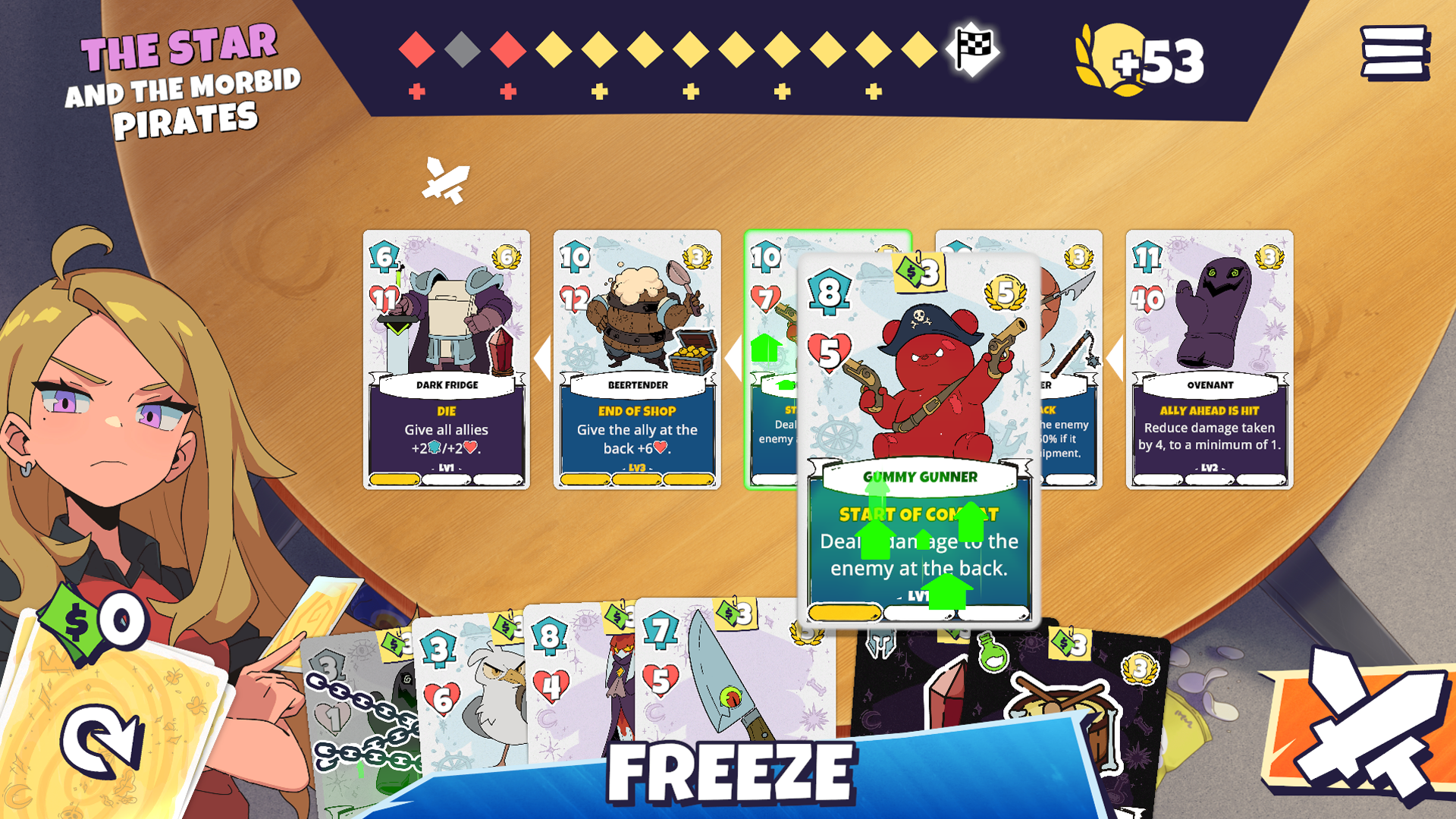The shop phase gives you $10 to work with; each card will have a specific cost, or you can reroll if you don’t like any of them. Buy up to five cards to fight to the death in the autobattle match. If your cards are feeling a tad weak, you can equip or use item cards. Some can be placed on your unit; this can be the health orb that gives +1 health to a unit after each shop phase, the hat creates a 1/1 minion after the main unit dies. Other items are a one time use like adding health and strength to cards or giving exp. These can blend well with specific synergies, so if you have a good item but can’t afford it, freeze it to buy it in the next shop phase.