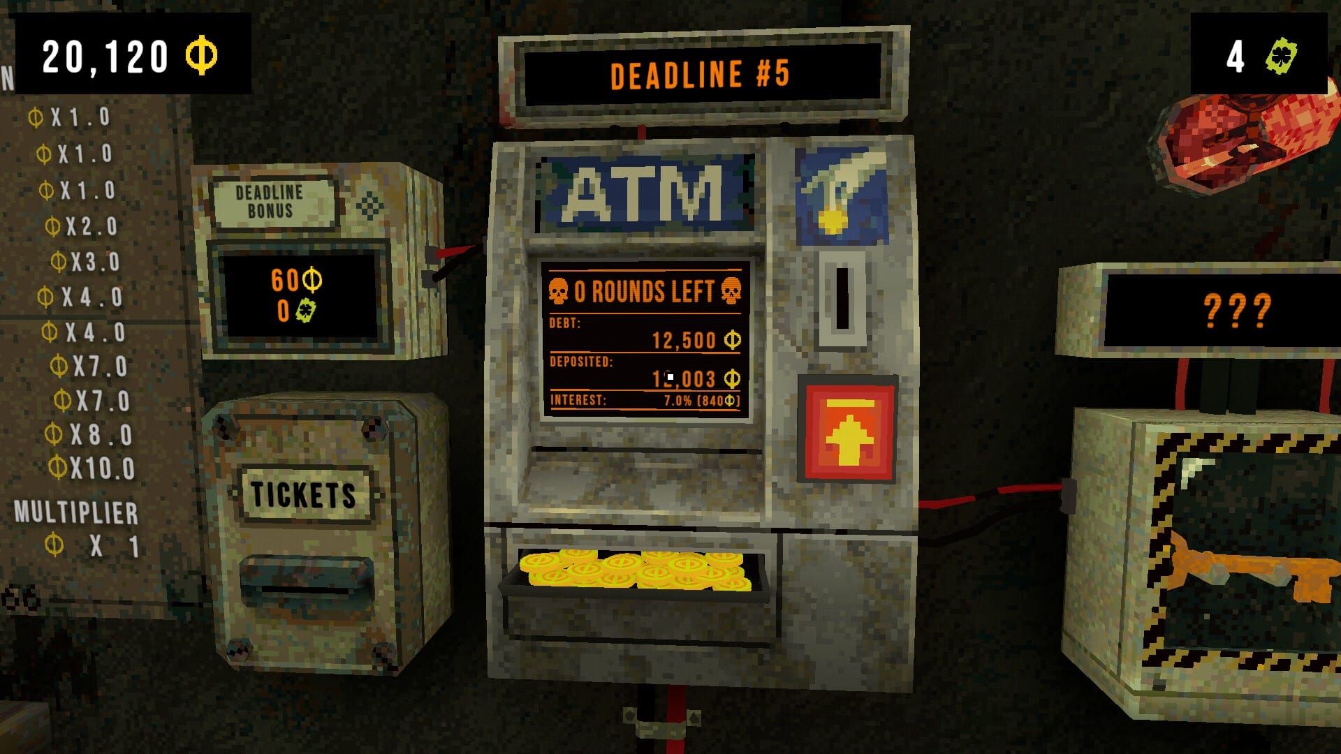 When a deadline is in progress, a board next to the ATM will show a bonus if you finish the deadline on that round. This includes coins and tickets, but each round that passes, the ticket amount will decrease. So, do you pay off early and get tickets for a better charm, or wait to see how much money you can and go for a Mystery Pack?