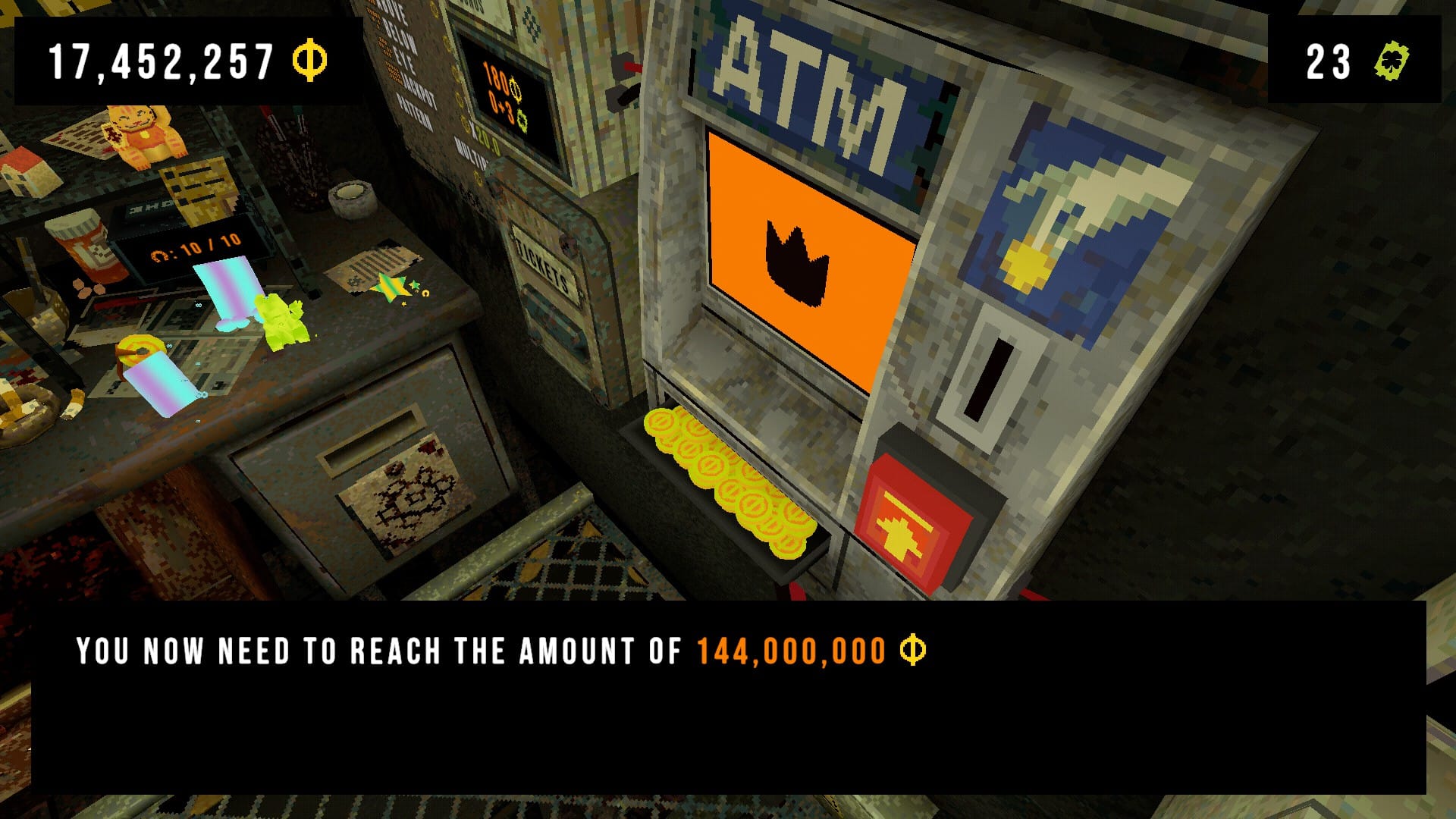 Starting with just a slot machine, you will have to cash out enough money to pay off your ever-growing debt, known as deadlines. You start every run with 30 coins, and need a total of 75 coins in three turns to survive the first deadline. If you pass, you will need 200 coins for the second deadline. Each deadline will raise your debt exponentially, so you will need to find ways to manipulate your payout. This is where charms come in. Let’s take a quick intermission to talk about the charm shop.